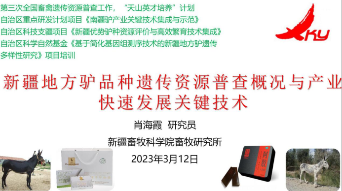 第四屆國家畜禽遺傳資源委員會馬驢駝專業委員會成員、“科創中國”現代驢產業服務團專家、自治區“天山英才”科技創新領軍人才、新疆畜牧獸醫學會會員、新疆畜牧科學院畜牧研究所馬屬動物研究室主任肖海霞研究員作為專家服務團代表之一,在3月12日由沙灣市農業農村局四級調研員賽里克·切里扎提同志主持的2023年新疆留學人員“同心向黨”為民服務沙灣行活動中,開展了《新疆地方驢品種資源普查概況與產業快速發展關鍵技術》專題講座。會上,肖海霞研究員主要從第三次全國畜禽遺傳資源普查概況、新疆地方驢遺傳資源普查概況、驢專門化品系培育技術、驢高效繁殖技術、驢健康養殖技術、驢產品深加工技術共6個方面進行了全面介紹與分享,并與參會的沙灣市畜牧獸醫站、動物衛生監督所工作人員,各鄉鎮畜牧獸醫站站長、防疫員,以及沙灣市三牧動物防疫技術服務有限責任公司、亞寧農業科技開發有限公司技術骨干,圍繞馬屬動物常見傳染病、飼養管理和繁殖技術等問題進行了交流討論,會場氣氛熱烈。
