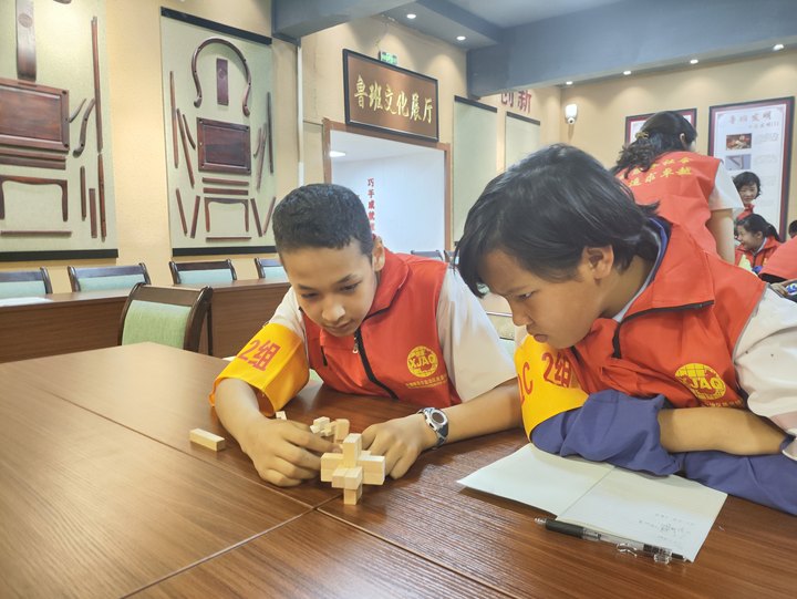 隨后,大家來到“魯班文化廳”開展質量創新與實踐科普活動,質量老師向同學們講解了質量管理的核心內容,培養大家從小養成質量管理PDCA(計劃-執行-檢查-處置)的思維方式,引導同學們做任何事情都要“想好了再做,一次把事情做對”,并邀請優秀學員代表分享往期活動成果。博物館專業老師傳承魯班文化,弘揚工匠精神,講解魯班鎖的歷史、淵源和解鎖技巧。同學們四人一組動手拼裝魯班鎖,實踐過程中遇到問題,小組成員互相探討,互相幫助,培養了學生的空間想象能力、邏輯思維能力及團隊合作能力。