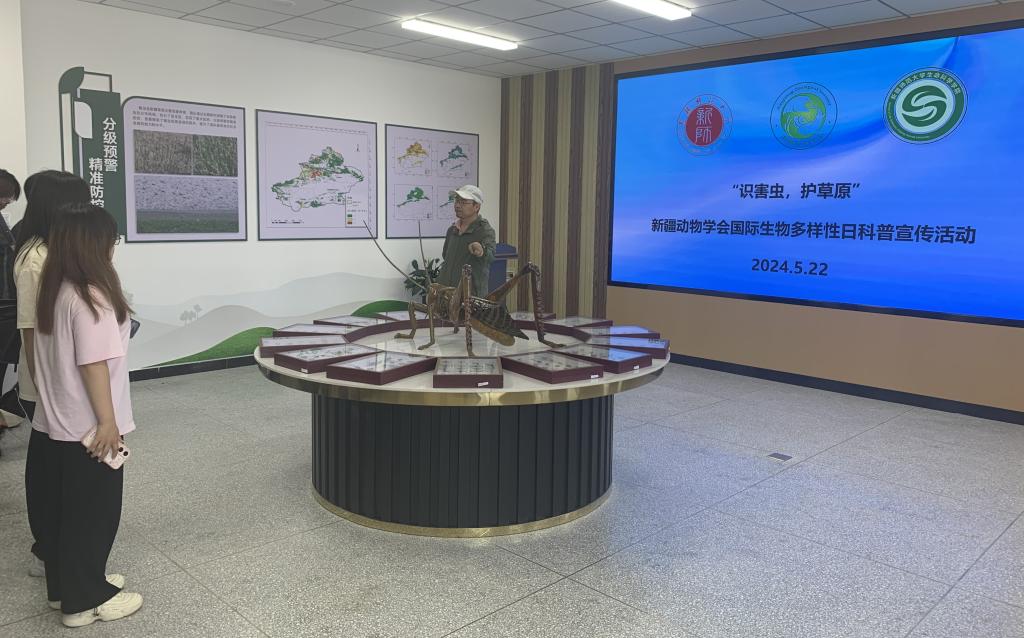 2024年5月22日是第24個國際生物多樣性日。為了進一步增強青少年對新疆草原生態(tài)保護的認(rèn)識,了解草原蟲害綜合防控對于維持草原生物多樣性與生態(tài)平衡的重要意義,新疆動物學(xué)會在新疆師范大學(xué)生命科學(xué)學(xué)院科技樓“中亞區(qū)域跨境有害生物聯(lián)合控制國際研究中心”舉辦“識害蟲,護草原”的系列參觀活動。新疆動物學(xué)會常務(wù)理事張永軍副教授、青年理事劉慧霞博士帶領(lǐng)學(xué)生們參觀了昆蟲標(biāo)本,講解了地形沙盤,觀看了草原害蟲暴發(fā)時的視頻,通過此次活動,旨在讓學(xué)生了解新疆草原主要害蟲種類、形態(tài)特征,激發(fā)學(xué)生學(xué)習(xí)興趣和熱情,深化青少年保護生態(tài)環(huán)境的意識。