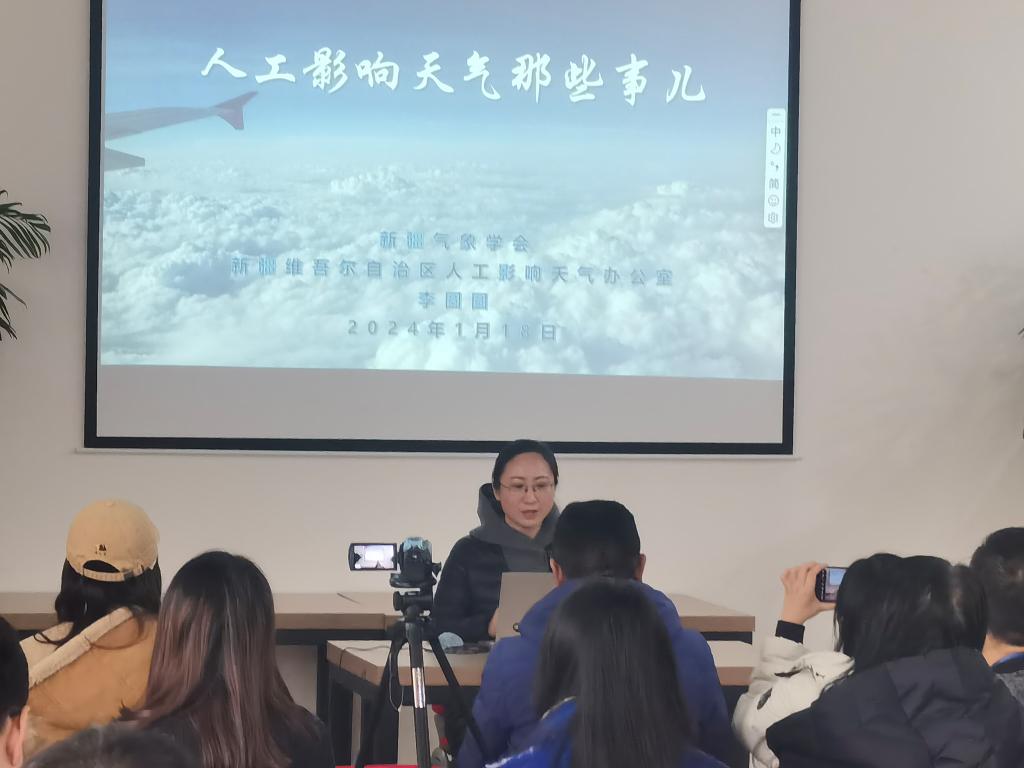 自治區(qū)人影辦副主任、高級工程師李圓圓向氣象局各直屬單位職工、社區(qū)居民講解人工影響天氣的原理,包括人工增雪、人工防雹的相關(guān)知識,并與到場的各族居民積極互動,用通俗易懂的語言和生動的例子向大家科普氣象知識,增強居民防災(zāi)減災(zāi)意識,保障人民生產(chǎn)生活安全。