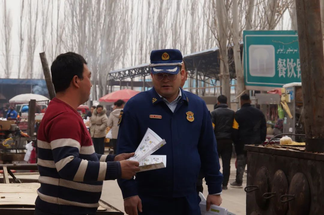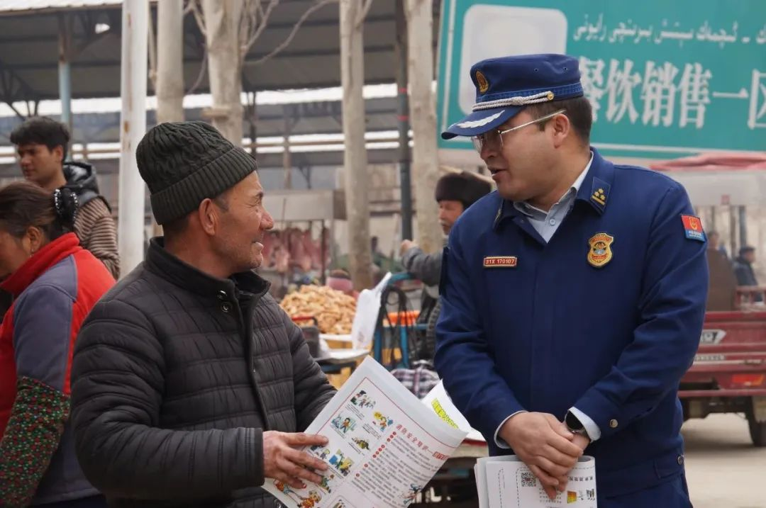 隨后,大隊宣傳員來到巴扎集市為過往群眾和商戶發放消防宣傳資料,重點針對用電、用氣、用火等方面的消防安全知識進行了講解,并結合春季大風天火災特點提醒群眾大風天禁止室外動火、嚴禁違規燒荒、傾倒煤灰渣等易燃物品時要遠離柴草堆垛、勿在房屋周圍堆放柴草等。