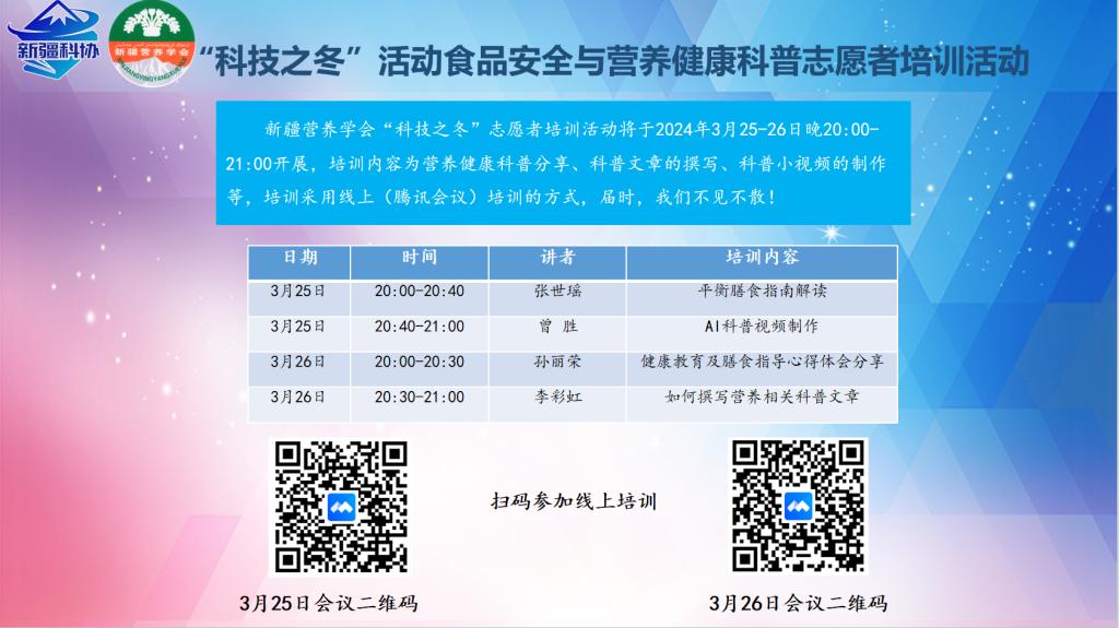 此次活動共招募涵蓋臨床醫師、公衛醫師、營養醫師、護士、高校及中學教師、在校大學生、在校研究生等來自全疆各地的112名志愿者,先后在2024年3月25-26日,圍繞平衡膳食指南解讀、Al科普視頻制作、健康教育及膳食指導心得體會分享、如何撰寫營養相關科普文章等內容,以線上(騰訊會議)培訓的方式開展。志愿者反饋培訓內容“干貨滿滿、接地氣”、獲益匪淺。