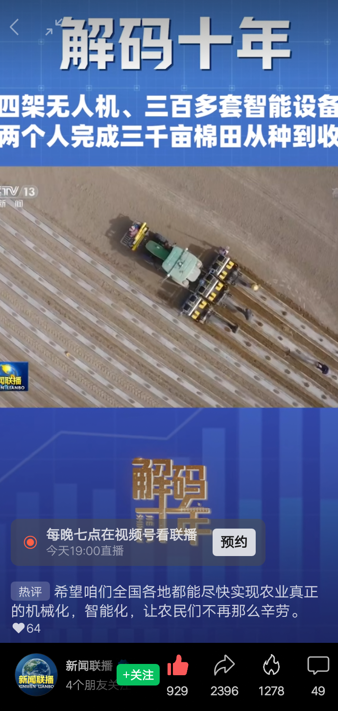 2021年在新疆巴音郭楞蒙古自治州尉犁縣廣茂的棉田上出現了從未有過的身影,兩個人四架無人機300多套智能設備,完成3000棉田的從種到收的全過程。通過農業無人化設備采集的農業地理信息數據、農業生產數據、作物生長數據及生長環境數據,讓農民掌控土地、作物與農事控管全過程,結合農業專業知識,首創農業人工智能與智慧農場管理平臺,輔助生產者做出科學的農事決策。巴州極飛航空科技有限公司科技創新負責人艾海鵬說:“兩個人挑戰3000畝超級棉田,哇,看看能不能用我們科技,再給農業帶來一些新的變化?”無人播種機在大地上拖出筆直痕跡,路線誤差在2.5厘米以內,澆灌、檢測、施肥一個小小的平板電腦就能搞定,當收獲的季節到來,采棉機在這塊三千畝的棉田共收獲棉花七百噸,曾今依靠傳統方式種植的尉犁縣農業生產,現在插上一個個數字科技的翅膀,以超乎想象的速度邁向農業現代化建設。