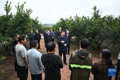 9月24日,中共中央總書記、國家主席、中央軍委主席習(xí)近平在浙江考察結(jié)束返京途中,來到山東省棗莊市考察。這是習(xí)近平在位于嶧城區(qū)的冠世榴園石榴種植園了解石榴產(chǎn)業(yè)發(fā)展情況。新華社記者燕雁攝