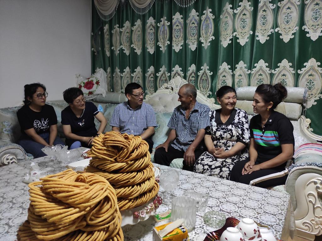 在農(nóng)戶代表麥提托合提家,各色干果擺滿了餐桌,剛炸好的馓子也端了上來,寬敞的房子里充滿了濃濃的節(jié)日氣氛。麥提托合提熱情的招呼大家品嘗馓子,高興的向大家介紹今年產(chǎn)業(yè)發(fā)展的情況,總領(lǐng)隊(duì)李永晟充分肯定了他對(duì)村里產(chǎn)業(yè)發(fā)展的貢獻(xiàn),鼓勵(lì)他繼續(xù)發(fā)揮產(chǎn)業(yè)帶頭人的優(yōu)勢(shì),帶動(dòng)更多的村民走上致富的道路,把日子過得更加紅火。