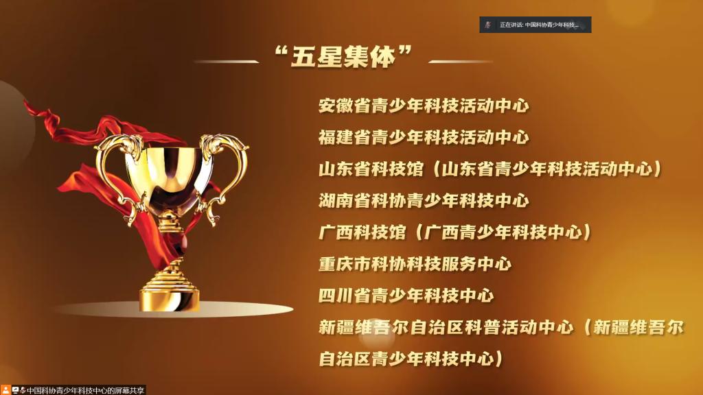 5月12日,2022年度科協系統青少年科技教育活動工作研討會以線上線下相結合方式召開。會議對2021年度青少年科技教育成績突出的單位進行了表彰,其中,新疆科普活動中心(新疆青少年科技中心)獲評青少年科技工作“五星集體”。自治區科協一級巡視員羅夫永圍繞新疆科普資源賦能“雙減”落地見效作典型交流發言。