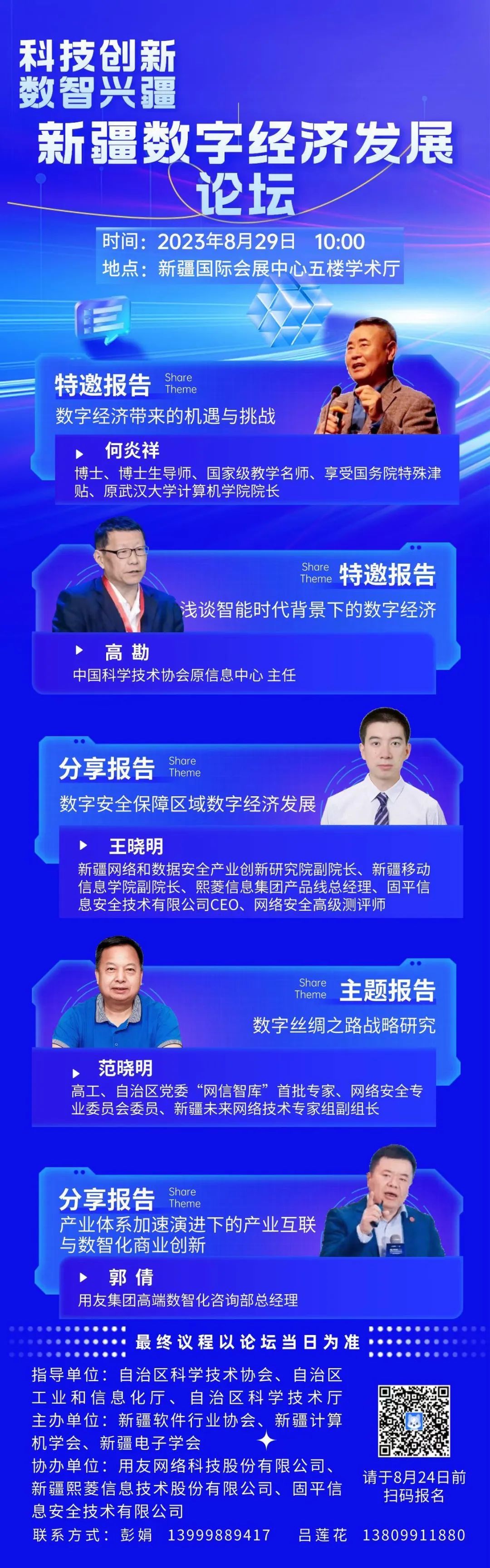 8月29日(周二)10:00-14:00,由自治區(qū)科協(xié)、自治區(qū)工信廳、自治區(qū)科技廳指導(dǎo),新疆軟件行業(yè)協(xié)會(huì)、新疆計(jì)算機(jī)學(xué)會(huì)、新疆電子學(xué)會(huì)主辦的“科技創(chuàng)新 數(shù)智新疆”新疆?dāng)?shù)字經(jīng)濟(jì)發(fā)展論壇,將在新疆國際會(huì)展中心學(xué)術(shù)報(bào)告廳召開。