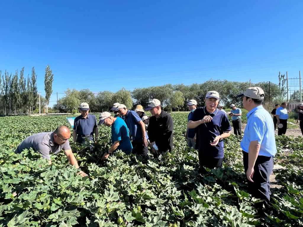 隨后,調研組一行走進試驗田,近距離查看棉花長勢,詢問棉田管理及施肥澆水等相關問題,并對縮節胺使用技術、肥水運籌與生殖生長協調、長勢不同的棉田澆水時差等問題做了現場交流。