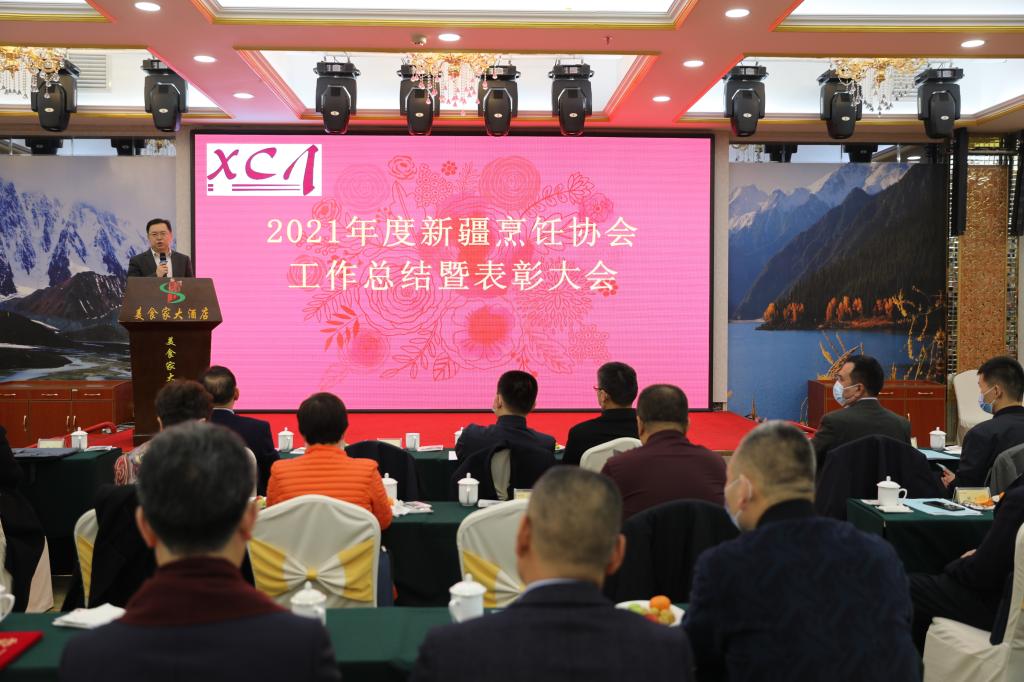 會上,新疆烹飪協會會長余貴濤對2021年工作進行總結。新疆烹飪協會分別對烏魯木齊凱瑞酒店管理有限公司陳飛等15個新疆餐飲行業的領軍人物、23個2021年度新疆餐飲行業特別貢獻獎的單位和個人以及新疆突瑪麗斯大飯店(有限公司)等23家最受消費者喜愛的餐飲企業進行表彰,并聘任元老級中國注冊烹飪大師、中國烹飪協會名譽副會長、中國烹飪協會頂級烹飪大師匠傳委員會副主席張元松先生為新疆烹飪協會終身名譽會長。