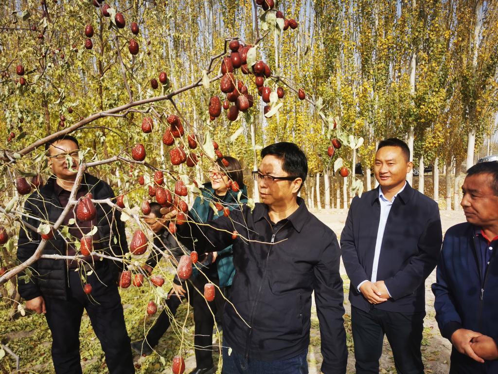 了解完甜瓜產業情況,王光強一行來到繁榮村紅棗地,現場查看了今年紅棗的收成情況,詢問了今年的市場行情,尤其是針對今年春季寒潮導致減產問題,他叮囑在場的駐村第一書記,要積極聯系紅棗銷路,做好市場行情預判,幫助棗農做好今年紅棗銷售工作,確保棗農收入不減,信心不減。同時,要切實發揮科協優勢,積極聯系紅棗種植管理方面的專家,就棗樹冬季管理等做好培訓。