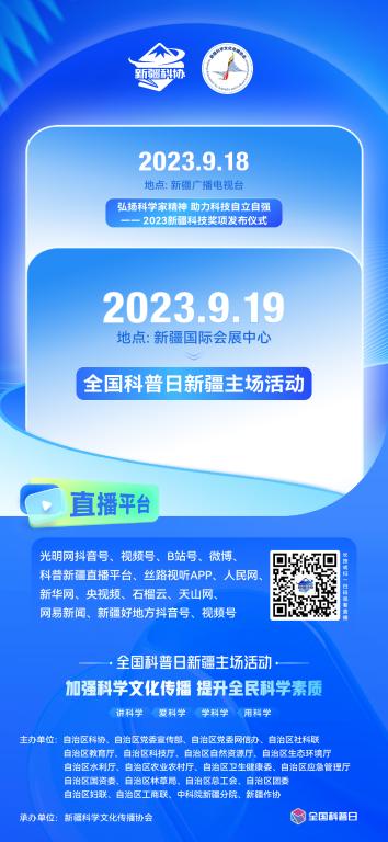 主要內容:小學生《啟明星》情景劇表演;20位新疆科學文化傳播大使聘任儀式;王小東院士進疆60周年紀念活動;新疆原創優秀科普書籍、音視頻作品、科普劇等展演;“放飛天山科技云號飛船”啟動儀式。
