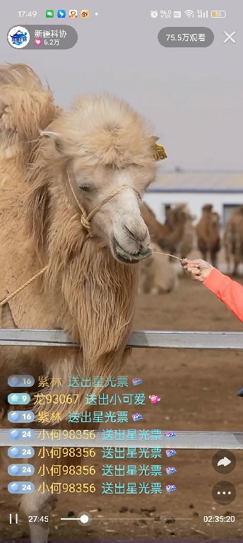 除此之外,還增設(shè)了諸多創(chuàng)意與互動環(huán)節(jié),讓整場直播更加豐富有趣。如“柯小駝”系列文創(chuàng)產(chǎn)品抽獎,可愛的“柯小駝”抱枕、精致的“柯小駝”公仔以及生動有趣的“柯小駝”滑沙擺件等,每一款都融入了柯坪本地白駝和柯坪紅沙漠的元素,既具有文化特色,又兼具實用與美觀。在駱駝吃播環(huán)節(jié),吃播“達人”“駝駝白”向網(wǎng)友們展示了駱駝獨特的進食方式。它的每一個動作、每一個表情都充滿了趣味與生動,讓網(wǎng)友們仿佛置身于現(xiàn)場,與駱駝一起享受著這份美食美景之旅。這些新增環(huán)節(jié)不僅豐富了直播內(nèi)容,也讓觀眾在參與互動的過程中更加深入地了解柯坪縣駱駝產(chǎn)業(yè),感受柯坪縣悠久的歷史和豐富的文化內(nèi)涵。