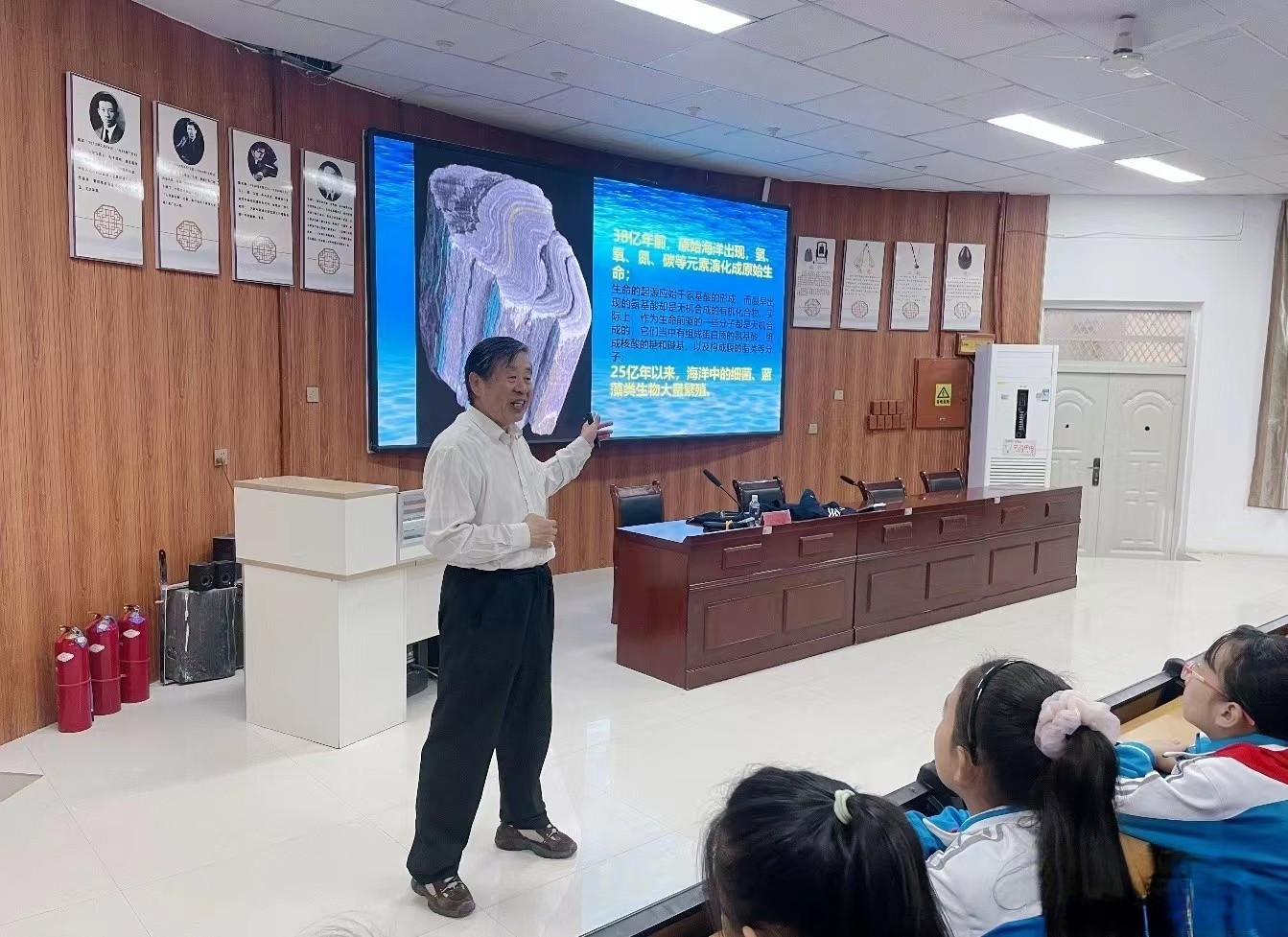 中國科學院老科協研學導師團副團長、中國石化石油勘探開發研究院教授級高級工程師、中國地質學會地質學史專業委員會副主任、國際地科聯地質學史專業委員會委員戴進業老師來到若羌縣第一小學,作了題為《探秘海洋》的科普講座。戴老師從地球起源說起,介紹了海洋形成、海洋地貌、海洋生物以及海底礦產資源。戴老師深入淺出的講解,使同學們了解到海洋方面的科學知識,開闊了學生視野,提高了對海洋科技的興趣。
