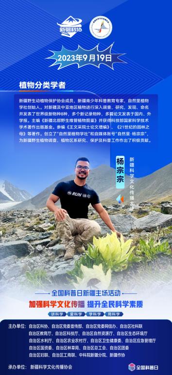 想看最攢勁的植物科普,就在2023年9月19日全國科普日新疆主場活動現(xiàn)場!新疆科學(xué)文化傳播大使、網(wǎng)絡(luò)科普達(dá)人楊宗宗將與觀眾分享他在新疆植物保護(hù)和科普方面的收獲和成果,敬請期待!