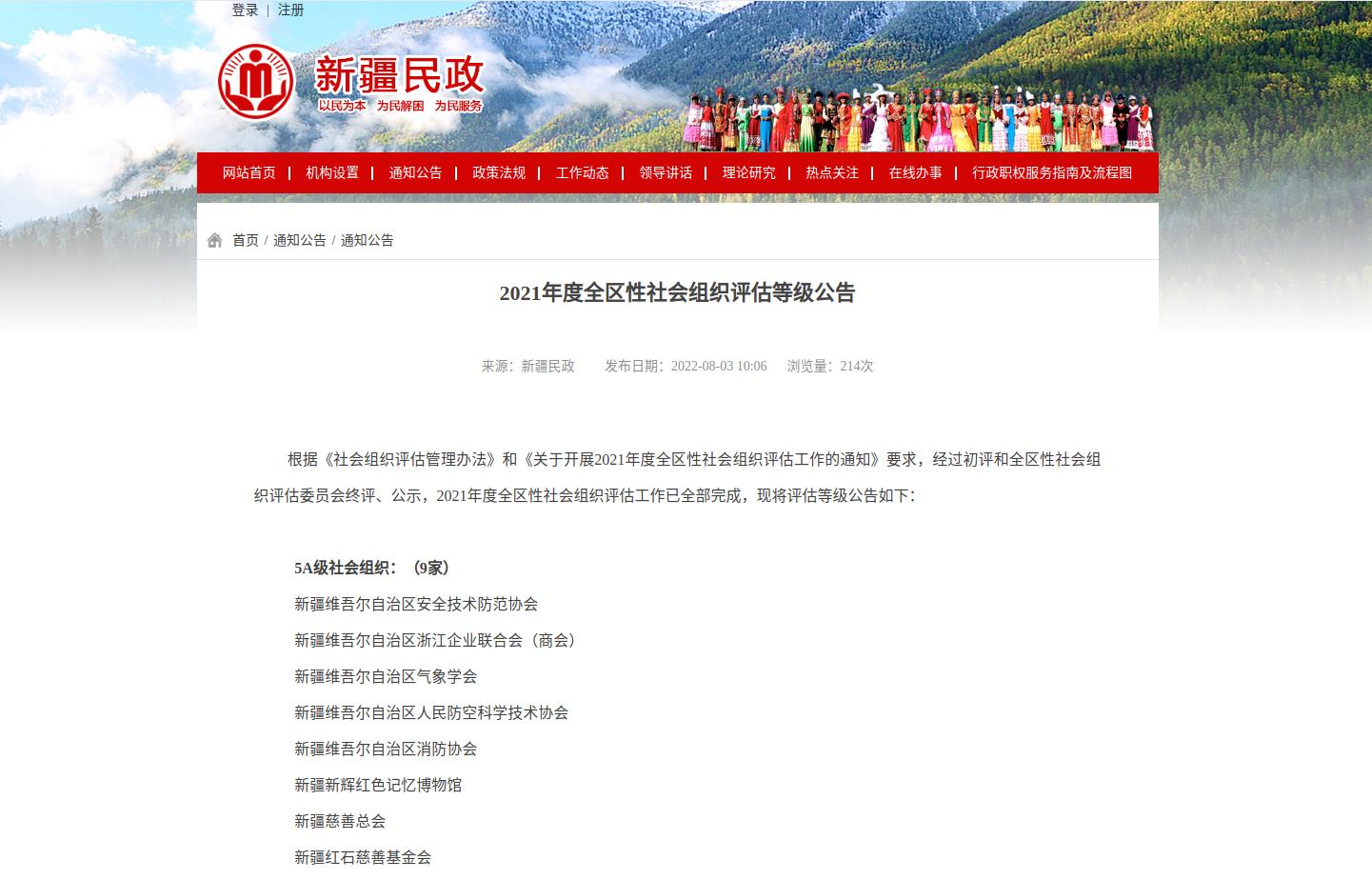 近日,自治區民政廳正式公布關于2021年度全區性社會組織評估等級公告。經學會申報、初評、全區性社會組織評估委員會終評、面向社會公示等程序,確定了43家學會評估等級。其中,自治區科協所屬的新疆氣象學會、新疆人民防空科學技術協會、新疆消防協會獲評5A級社會組織。