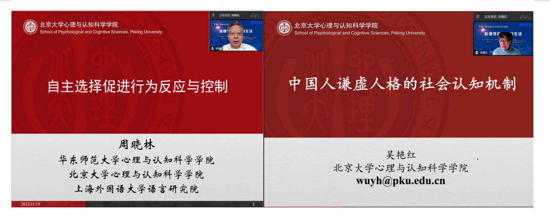 特邀報告環節,來自華東師范大學心理與認知科學學院周曉林教授、北京大學心理與認知科學學院吳艷紅教授分別作題為《自主選擇促進行為反應與控制》《中國人謙虛人格的社會認知機制》的報告。周曉林教授從研究背景、自主選擇促進行為與控制、結論三個方面進行報告,用13個行為實驗探究了自主選擇對行為的影響,回答了自主選擇影響個體行為表現的方式、相應認知加工的具體層次以及制約因素;吳艷紅教授從謙虛人格的社會認知特征出發,探討了他人對謙虛者的印象以及謙虛者的自我印象,闡明了謙虛人格對心理健康產生的影響機制以及謙虛影響社會交往的認知神經機制。