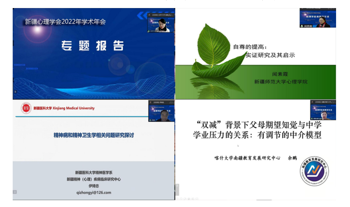 專題報告環節,來自新疆師范大學心理學院聞素霞教授,新疆醫科大學第一附屬醫院伊琪忠主任,喀什大學南疆教育發展研究中心主任、教育科學學院副院長余鵬教授分別作題為《自尊的提高:實證研究及其啟示》《精神病和精神衛生學相關問題研究探討》《“雙減”背景下父母期望知覺與中學生學業壓力的關系:有調節的中介模型》的報告。聞素霞教授通過分享三個實證研究,探究不同自尊者的特質及對提高自尊的啟示;伊琪忠主任從精神病與精神衛生問題的現狀、精神疾病的病因學研究現狀與心理學工作三個方面展開,著重探討了心理學和精神衛生學的合作發展問題;余鵬教授從選題思考出發進行分享,基于發展情景理論,納入教師期望知覺、自主調節學習變量,探究父母期望知覺對中學生學業壓力的影響。