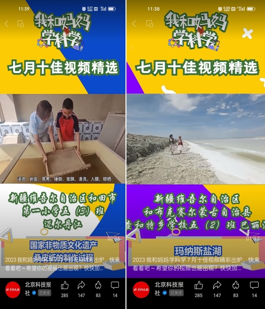 在今年“我和媽媽學(xué)科學(xué)”活動中,和田市第一小學(xué)五(3)班學(xué)生邁爾丹江與母親一起拍攝發(fā)布的科普視頻《國家非物質(zhì)文化遺產(chǎn)桑皮紙的制作過程》、和布克賽爾蒙古自治縣查和特鄉(xiāng)學(xué)校五(2)班學(xué)生巴麗江與母親一起拍攝發(fā)布的科普視頻《瑪納斯鹽湖》入選7月全國十佳視頻。自治區(qū)科協(xié)《依托各類科普陣地,帶動群眾科學(xué)素質(zhì)提升》、中國科學(xué)院吐魯番沙漠植物園《探尋荒漠植物生存智慧,弘揚科學(xué)家精神》及塔城地區(qū)烏蘇市第四中學(xué)《結(jié)合地方特色,以“網(wǎng)”傳播科學(xué)》三個案例入選全國2023年“智愛媽媽”親子教育科普典型案例。