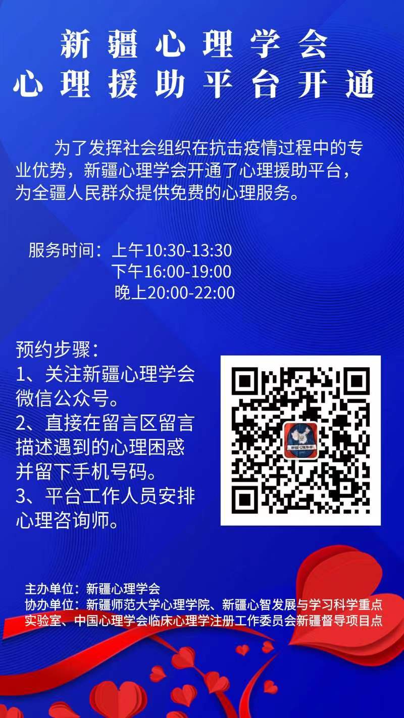 為了發(fā)揮社會(huì)組織在抗擊疫情過(guò)程中的專業(yè)優(yōu)勢(shì),根據(jù)自治區(qū)科協(xié)《致全區(qū)廣大科技工作者的倡議書(shū)》和自治區(qū)民政廳《社會(huì)組織積極助力疫情防控倡議書(shū)》,新疆心理學(xué)會(huì)開(kāi)通了心理援助平臺(tái),為全疆人民群眾提供免費(fèi)的心理咨詢服務(wù)。