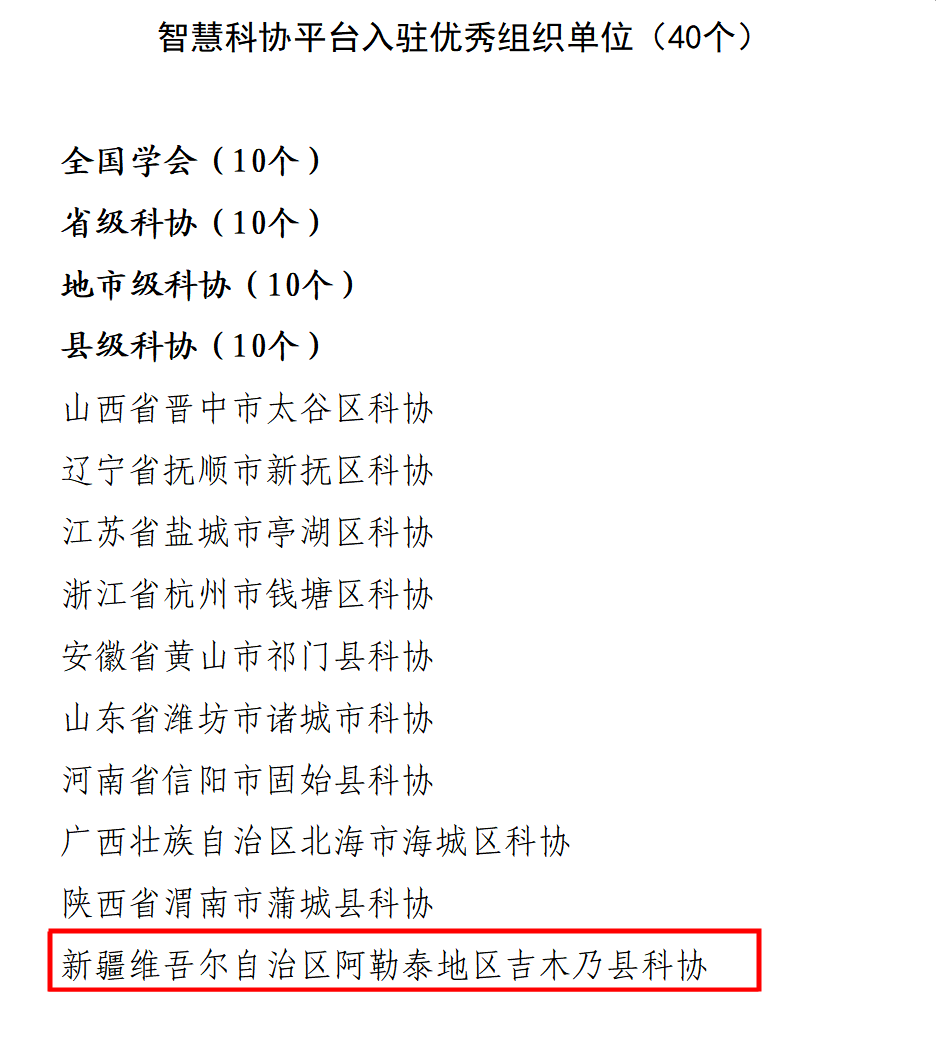 近日,中國科協辦公廳發布2023年全國科技工作者日活動優秀組織單位和特色活動通報表揚通知,自治區科協舉行的“‘一帶一路 健康新疆’華夏院士專家新疆行”活動因組織動員廣泛、活動效果良好、社會反響熱烈獲評“特色活動”。同時,阿勒泰地區吉木乃縣科協獲評“智慧科協平臺入駐優秀組織單位”。