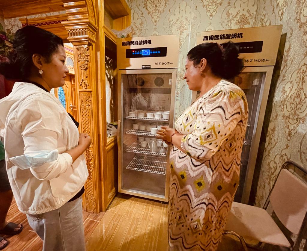 在夏央村村民阿卜杜拉·努日家中,努爾古麗·熱合曼教授通過(guò)自治區(qū)科協(xié)科技服務(wù)基層項(xiàng)目,定點(diǎn)開(kāi)展庭院老酸奶產(chǎn)業(yè)培育指導(dǎo),并為其配備了酸奶機(jī)、消毒機(jī)、冷藏陳列柜等設(shè)備和溫度計(jì)、一次性酸奶杯等用品,在技術(shù)上培訓(xùn)村民制作酸奶的工藝,提高產(chǎn)出效益、擴(kuò)寬致富門(mén)路。阿卜杜拉·努日激動(dòng)地說(shuō)道:“感謝自治區(qū)科協(xié)和工作隊(duì)能選擇我們家作為技術(shù)試點(diǎn),我們一定會(huì)好好珍惜這個(gè)機(jī)會(huì),認(rèn)真學(xué)習(xí),用心做好每一份酸奶。”