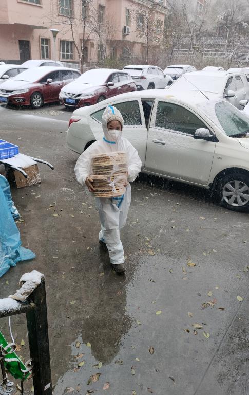 買合布孜木·艾合買提是新疆科普雜志社的一名編輯,目前下沉至天山區團結路街道領館南社區,主要負責物資保供工作。她每天早晨吃完早飯,更換防護服下樓與院內超市銜接登記居民所需品。從上午10點左右開始聯系各個樓的志愿者來接蔬菜包等生活必需品,并督促及時配送到位,12點左右將送到小區門口的藥品,進行消殺和登記,安排配送員送至居民家里。這些是她下沉后每天都要重復做的工作?!靶⌒ 钡乃呀洺蔀榱祟I館南社區防疫一線工作人員這個大群體的一部分了。