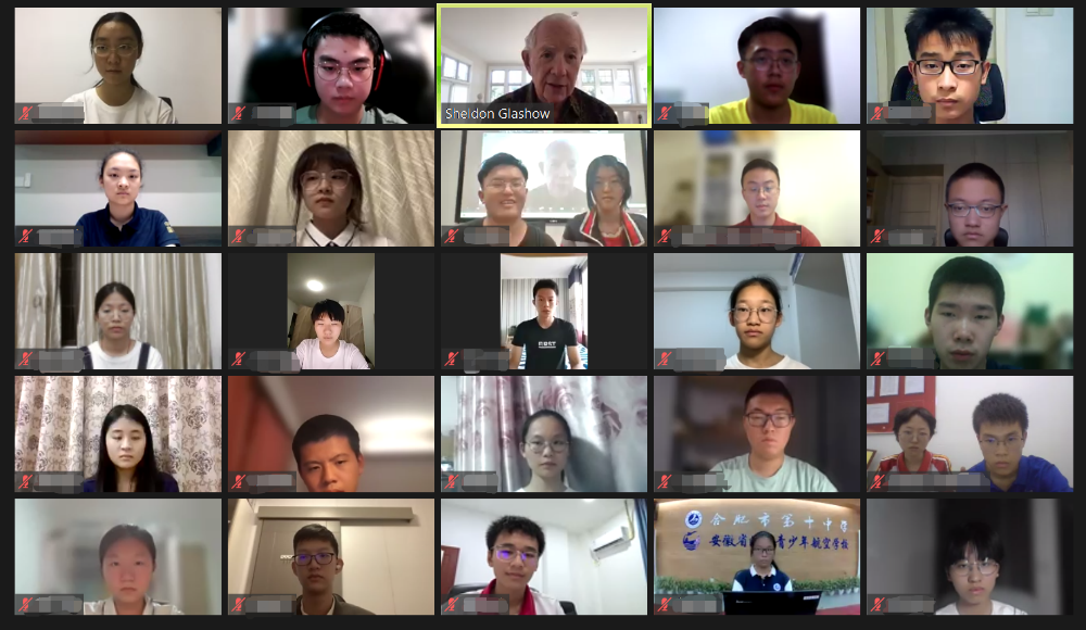 謝爾頓?李?格拉肖教授是世界著名物理學(xué)家,主要研究領(lǐng)域是基本粒子和量子場(chǎng)論,因其杰出貢獻(xiàn)獲得1979年諾貝爾物理學(xué)獎(jiǎng)。他以《切倫科夫輻射:超越光速的存在——這縷淡藍(lán)色輝光為何頻頻閃耀諾貝爾獎(jiǎng)?》為主題,從切倫科夫輻射開始向營員們介紹了相關(guān)學(xué)術(shù)研究成果及自上世紀(jì)以來各國科學(xué)家在該領(lǐng)域的科研探索經(jīng)歷,激勵(lì)營員們崇尚科學(xué)、勇于探索。來自全國各地的6名青少年代表2022年高校科學(xué)營全體營員與謝爾頓教授開展對(duì)話,就關(guān)心的科學(xué)進(jìn)步與人類社會(huì)發(fā)展的關(guān)系、科學(xué)探究方法等進(jìn)行了熱烈的交流討論。