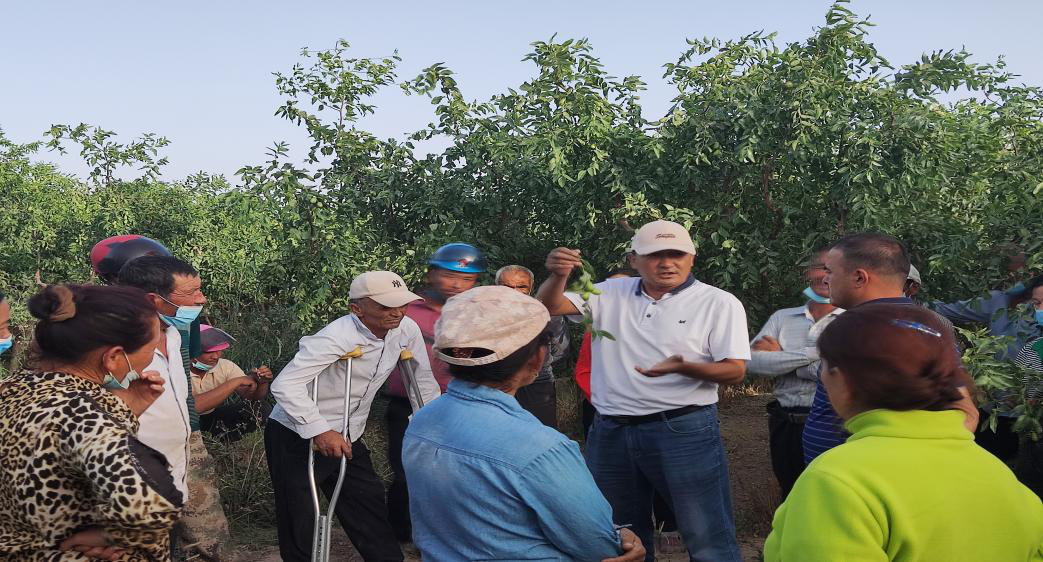 培訓(xùn)中,玉蘇甫·阿不力提甫副教授深入紅棗地,現(xiàn)場為棗農(nóng)指導(dǎo)講解了有關(guān)紅棗樹形修剪、病蟲害防治、提高坐果率、追肥、棗頭和棗吊處理、水分要求及成熟期采收要求等方面的知識。