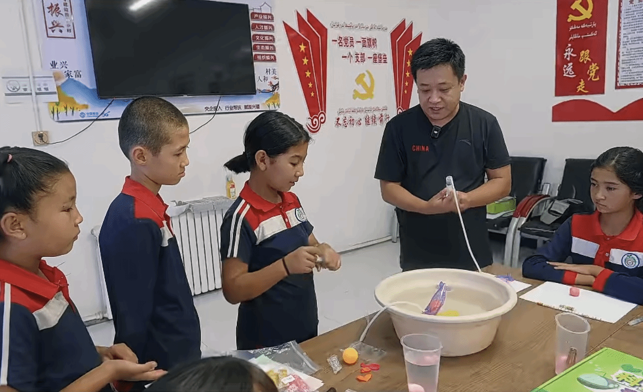 當(dāng)勒克蒙加克村的駐村工作隊(duì)員化身為“科學(xué)老師”,帶領(lǐng)孩子們走進(jìn)了一個(gè)個(gè)奇妙的科學(xué)世界。《螃蟹眼睛的啟示》課堂上,圖片里螃蟹那雙能360度旋轉(zhuǎn)的眼睛,讓孩子們驚嘆不已,眼神中滿是新奇;《魚(yú)的啟示》講解時(shí),魚(yú)鰭與船槳的巧妙聯(lián)系被揭曉,孩子們仿佛瞬間明白了這藏在生活里的科學(xué)奧秘。講到潛水艇的原理,工作隊(duì)員拿起裝滿水的瓶子演示上浮下沉,瓶身的每一次浮動(dòng)都牽動(dòng)著孩子們的目光,他們瞪大眼睛,仿佛自己也化作了穿梭水中的“小小潛水員”。