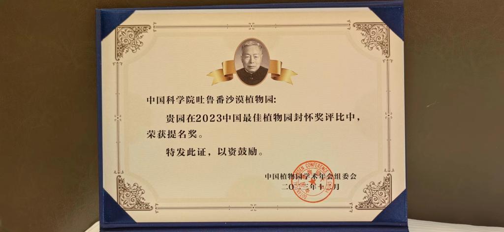 會議期間,中國植物園學(xué)術(shù)年會組委會公布了“封懷獎”,中國科學(xué)院吐魯番沙漠植物園在此次中國最佳植物園評比中獲得提名獎及榮譽證書。