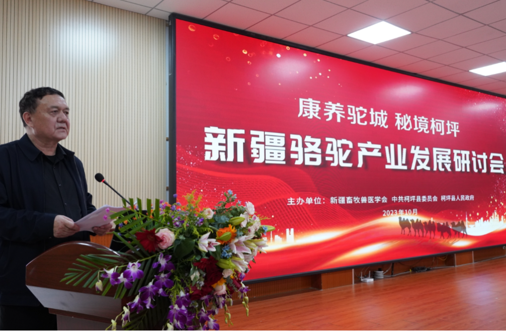 新疆畜牧科學院黨委委員、副院長巴哈提別克·阿哈泰代表新疆畜牧獸醫學會致辭,他表示此次會議的召開,是貫徹落實中央和自治區關于畜牧業高質量發展的部署要求,貫徹落實自治區高質量發展(南疆片區)第二次會議精神,貫徹落實阿克蘇地委、柯坪縣委關于地方特色優勢產業創新發展指示的具體體現。緊緊抓住在國內極具特色和發展潛力的新疆駱駝產業,通過“產學研、育繁推”一體化戰略思維,把新發展理念落實到全領域、全過程,堅持系統觀念、創新驅動,為全區鄉村振興和駱駝產業發展提供了科技支撐和經濟引擎動力,為新疆優質畜產品產業集群建設做出貢獻。