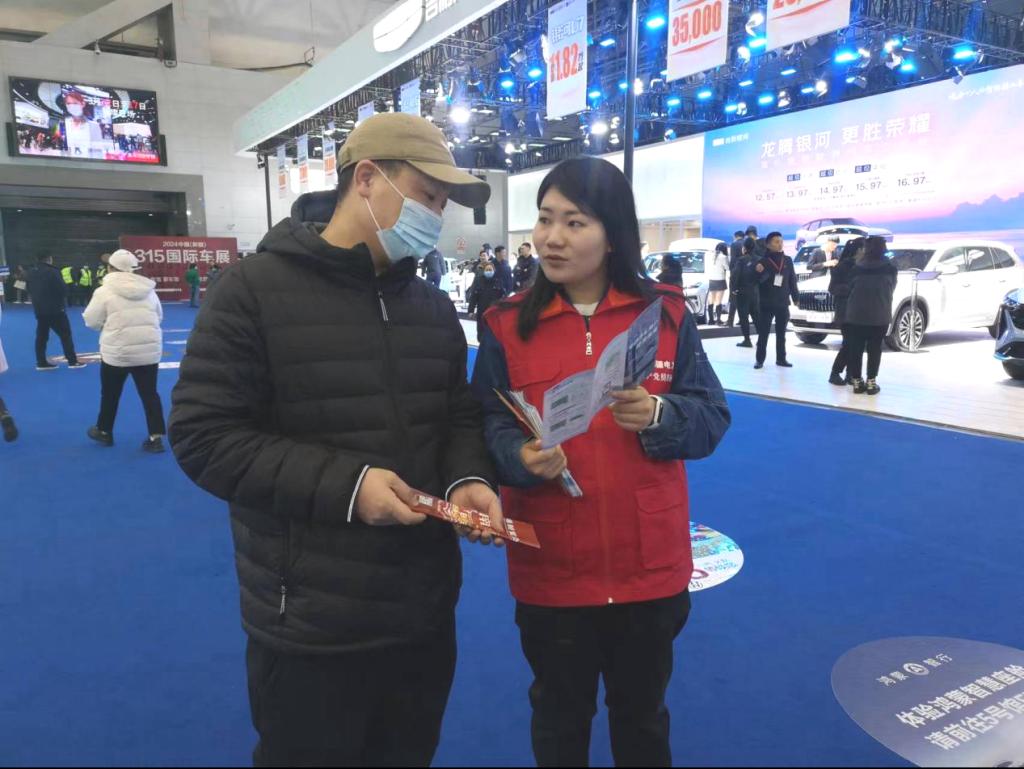 3月22日,新疆烏魯木齊電力科技工作者為車展參觀者講解“購車裝設(shè)充電樁一站式”快捷辦電服務(wù)