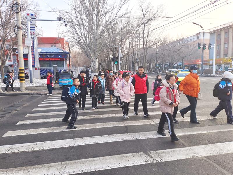 3月14日,新疆奎屯電力科技工作者在奎屯市三小附近組織學(xué)生安全過馬路