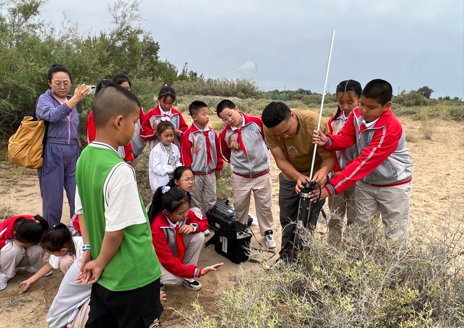 來自烏魯木齊市第113中學的學生從自治區環科院出發,前往位于五家渠市的準噶爾荒漠綠洲交錯區科學觀測研究站開展科普活動。到達觀測站后,自治區環科院科技人員從生態日的由來、生態文明思想的理論來源、野外觀測研究的意義和環境基礎數據如何支撐高質量發展等方面進行了科普講解,學生們深入沙漠參觀了布設在野外的土壤、植被、氣象和風蝕等各類野外觀測設備,現場講解了設備采集數據方式和功能。