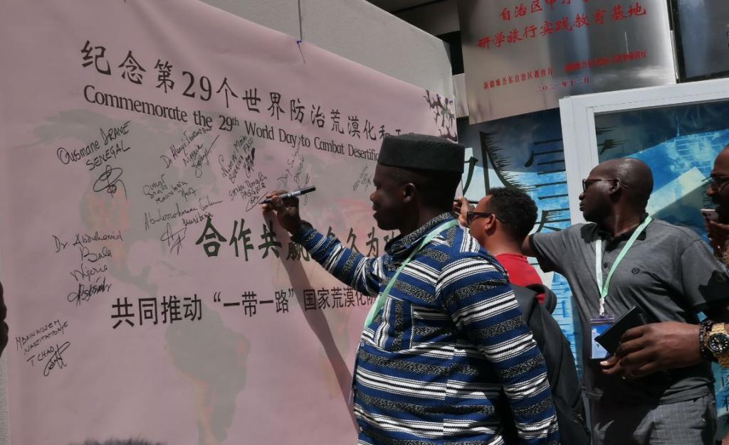 活動由新疆生地所正高級工程師、新疆地理學會副秘書長李生宇主持。新疆生地所黨委書記張向軍、泛非“綠色長城”組織秘書處Thiam Sakhoudia分別致辭。全體人員在紀念第29個世界防治荒漠化與干旱日的簽名墻上簽名,表示將共同推動“一帶一路”荒漠化防治國際科技合作。