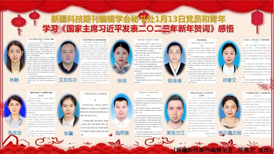 1月13日,新疆科技期刊編輯學(xué)會秘書處組織黨員和青年學(xué)習(xí)《國家主席習(xí)近平發(fā)表二〇二三年新年賀詞》。
