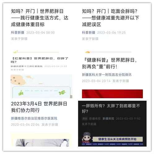 借助多媒體平臺,發揮專家優勢加大對活動的宣傳力度,通過新疆科協官網等公眾平臺宣傳世界肥胖日活動主題海報、世界肥胖日中國主題宣傳片等系列肥胖防控科普知識。組織專家、會員、注冊營養師圍繞主題撰寫制作科普文章、科普短視頻等。通過科普新疆平臺發布原創科普文章2篇,通過新醫微訊、新疆疾控等10余個公眾平臺進行專題宣傳,共發布科普專欄文章10多篇。