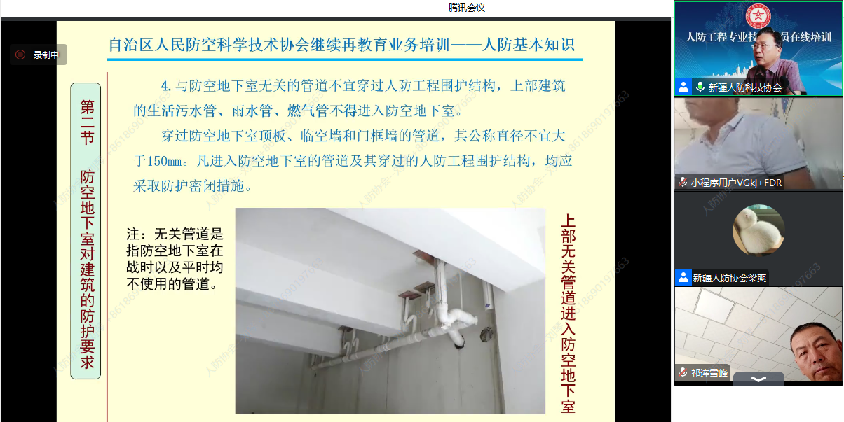 6月7日-9日,新疆人防科技協會舉辦全區人防工程專業技術人員在線培訓學習。培訓邀請到國家人防質量監督總站及新疆人防科技專家庫專家從理論和實踐相結合的角度,分別對“人防工程防護設備常見問題及處理方法”、“人防工程質量監督要點”、“人防工程質量問題預防與處理”和“人防工程竣工驗收程序及五方項目負責人職責”進行了系統闡釋,詳細解讀。