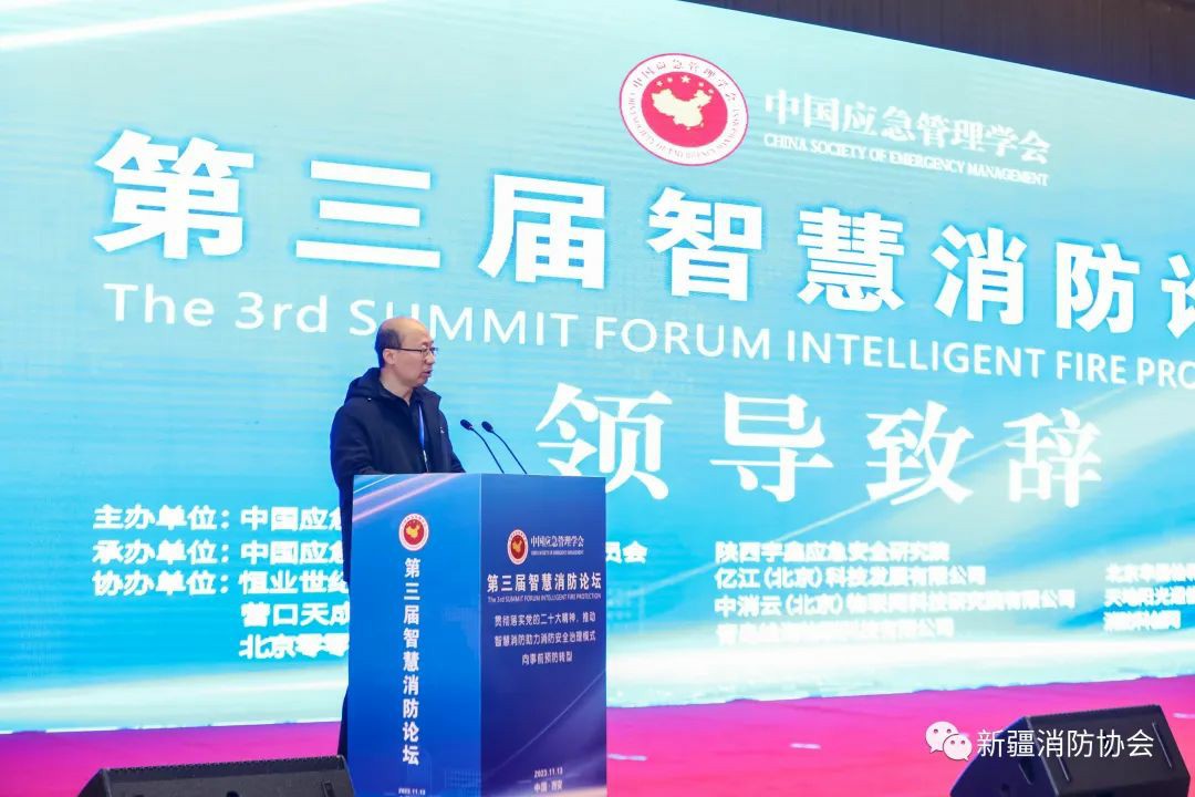 為總結推廣各地近年來建設、應用“智慧消防”手段提升火災防控和滅火救援能力的成效和經驗,促進智慧消防高質量發展,著力在防范化解重大安全風險方面發揮更大作用,2023年11月13日,由中國應急管理學會主辦的“第三屆智慧消防論壇”在西安舉辦。論壇由公安部原消防局政治委員、中國應急管理學會副會長、中國應急管理學會消防工作委員會主任王沁林主持,國家減災委員會秘書長、應急管理部原副部長、中國災害防御協會會長鄭國光,原國務院參事、原國務院應急管理專家組組長、國家減災委專家委員會原副主任閃淳昌,原公安部消防局副局長兼總工程師、中國應急管理學會消防工作委員會副主任、博士、高級工程師杜蘭萍及全國部分省級協會負責人、消防工作委員會委員、專家代表出席,新疆消防協會會長張照雄和秘書長閆懷宣等應邀出席。