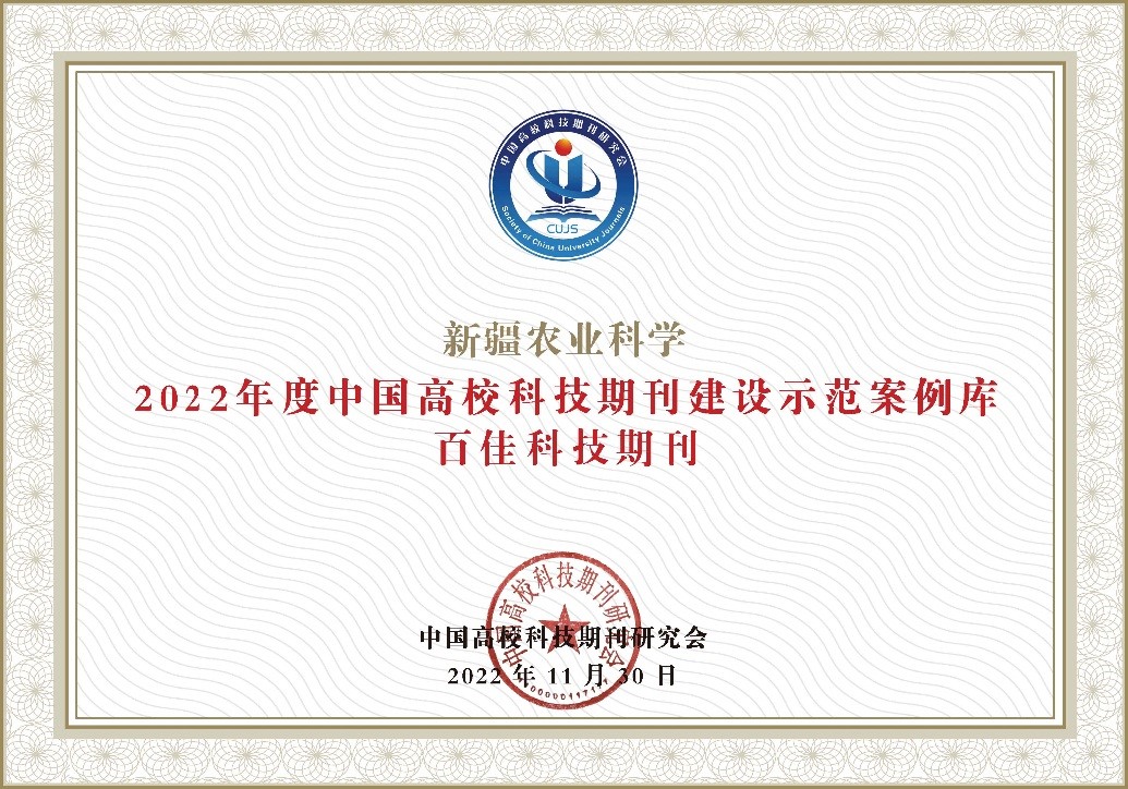 2022年11月30日,中國高校科技期刊研究會通過對國內外相關數據庫、評價機構的評價、計量結果等第三方客觀數據進行加權計算,經同行專家反復審核、確認《新疆農業科學》入選中國高校百佳科技期刊,這也是新疆唯一入選中國高校百佳科技期刊。