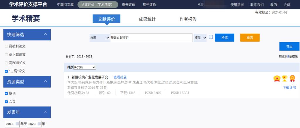 據中國知網《學術精要數據庫》(https://xsjy.cnki.net/)2023年11-12月最新發布的各學科高影響力論文顯示,《新疆農業科學》2013-2023年間發表的文章中共有658篇論文入選。其中,高PCSI(論文引證標準化指數)論文16篇(PCSI指數排名前1%的論文),高被引論文24篇(他引總頻次排名前1%的論文),高下載論文13篇(總下載頻次排名前1%的論文);同時為高PCSI論文、高被引論文和高下載論文的“三高”論文1篇。