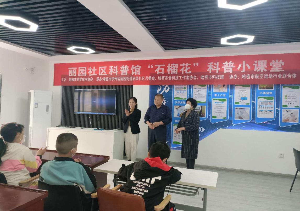 2023年3月25日上午,由哈密市科協主辦,麗園社區、老科技工作者協會、市科學技術館承辦,市航空運動行業聯合體協辦的“石榴花”科普小課堂開班儀式在麗園社區科普館舉行。此項活動為系列活動,共計11場次,麗園社區是活動第一站。本次活動由麗園社區李靜媛主任主持,老科協郭東京會長代表市科協、老科技工作者協會向本次活動表示祝賀。少年強則中國強。郭會長在開班儀式上強調,要積極推動科普進社區,教育孩子從小熱愛科學,培養熱愛學習、勤于思考,勇于探索的科學精神,為建設世界科技強國,實現中華民族偉大復興,而代代努力,接力傳承。