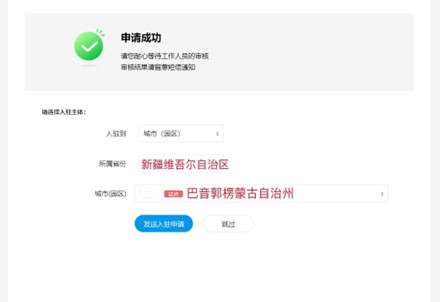 7.提交認證申請跳轉至申請頁面,申請頁面中城市(園區)選擇巴音郭楞蒙古自治州即可。
