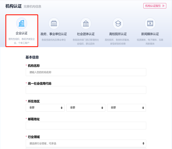 6.參照以下認證說明,選擇入駐組織類型為“企業認證”,填寫相關信息,并提交認證申請。