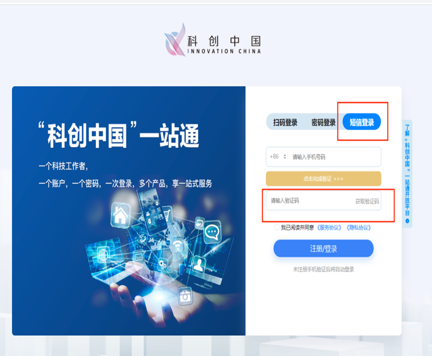 3.進入注冊登錄頁面后,點擊短信登錄,填寫短信驗證碼進行登錄。