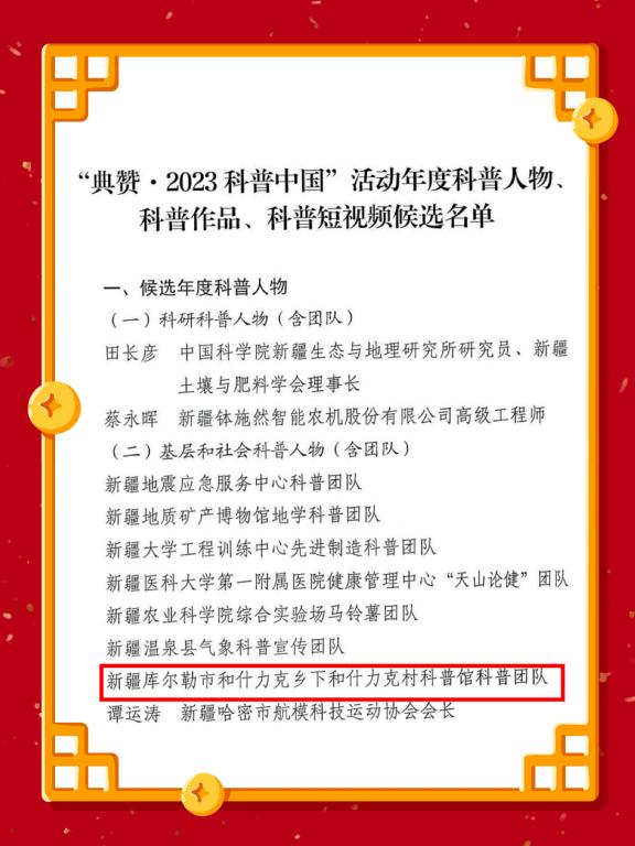 巴州科協(xié)認(rèn)真開展“典贊·2023科普中國(guó)”推薦工作,在新疆科協(xié)公示“典贊·2023科普中國(guó)”推薦活動(dòng)年度科普人物(10人)、科普作品(10個(gè))、科普短視頻(10個(gè))候選名單中,巴州1人獲科普人物(團(tuán)隊(duì))推薦;1部科普?qǐng)D書、1個(gè)科普展覽獲科普作品推薦;1個(gè)科普欄目獲科普短視頻推薦。