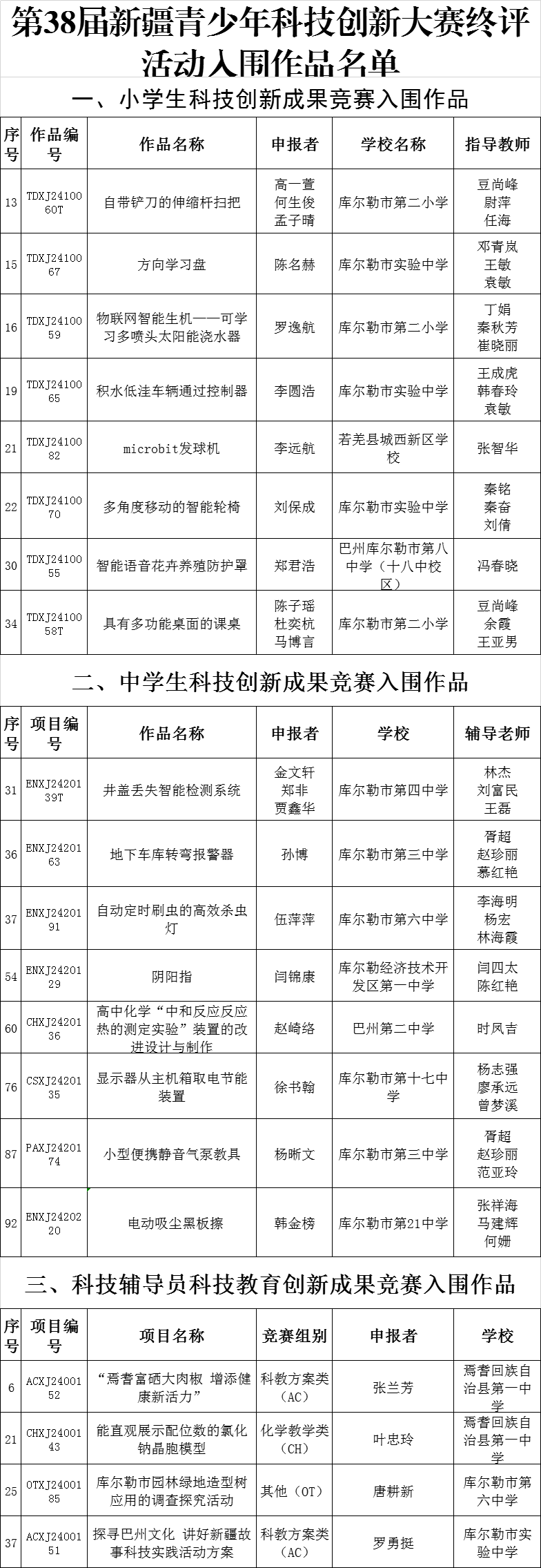 根據(jù)《關(guān)于舉辦第38屆新疆青少年科技創(chuàng)新大賽終評(píng)活動(dòng)的通知》要求,第38屆新疆青少年科技創(chuàng)新大賽終評(píng)展示活動(dòng)將于3月29-31日在烏魯木齊市舉辦,巴州地區(qū)共有40項(xiàng)作品入圍終評(píng)展示活動(dòng),占全疆參賽作品的14.13%。其中青少年科技創(chuàng)新成果16項(xiàng)、科技輔導(dǎo)員科技創(chuàng)新成果4項(xiàng),青少年科技實(shí)踐活動(dòng)5項(xiàng)、少年兒童科學(xué)幻想畫15幅。