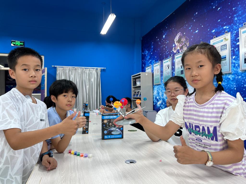動手探奇科學體驗小課堂,通過“拼裝蜘蛛機器人”“科技制作霸王龍”“太陽系行星儀模型”“自制火箭”及“兒童涂鴉畫卷”等多種新穎的主題開展動手動腦體驗活動。其中“太陽系行星儀模型”主題科學小課堂,邀請了新疆天文臺蒲廣新老師進行授課、講解,老師憑借淵博的知識、豐富的經驗及專業的視角帶學生了解太陽系,引領學生在拼裝、涂色過程中加深對太陽系的了解與認識,開闊了眼界,在動手制作中收獲了快樂,增強了動手能力、加強了團隊合作能力。