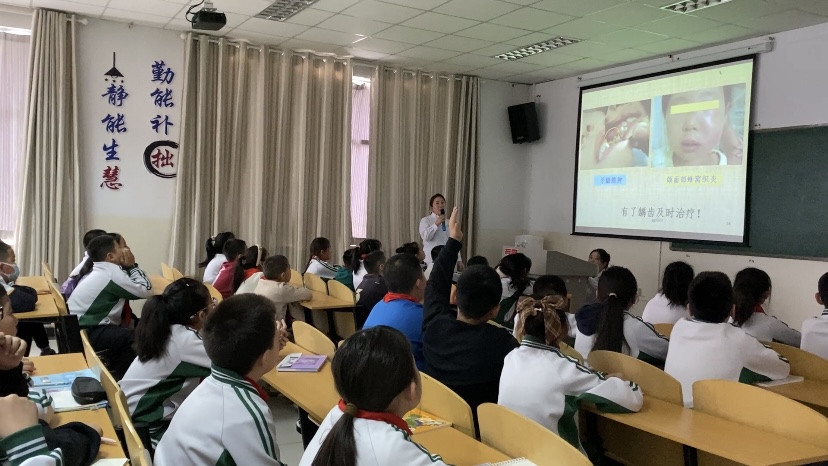 “刷牙時要用巴氏刷牙法,輕輕刷牙三分鐘”“我們的口腔里有門牙、尖牙、前磨牙、磨牙”“要學會使用牙線進行牙齒鄰面的清潔”“哪些食物是對我們的牙齒有益的”……從“認識牙齒”到“保護牙齒”,再到“健康飲食”,口腔醫(yī)生由淺至深、由表及里的解說,配合豐富的圖片示例,讓同學們深刻意識到健康牙齒的重要性。