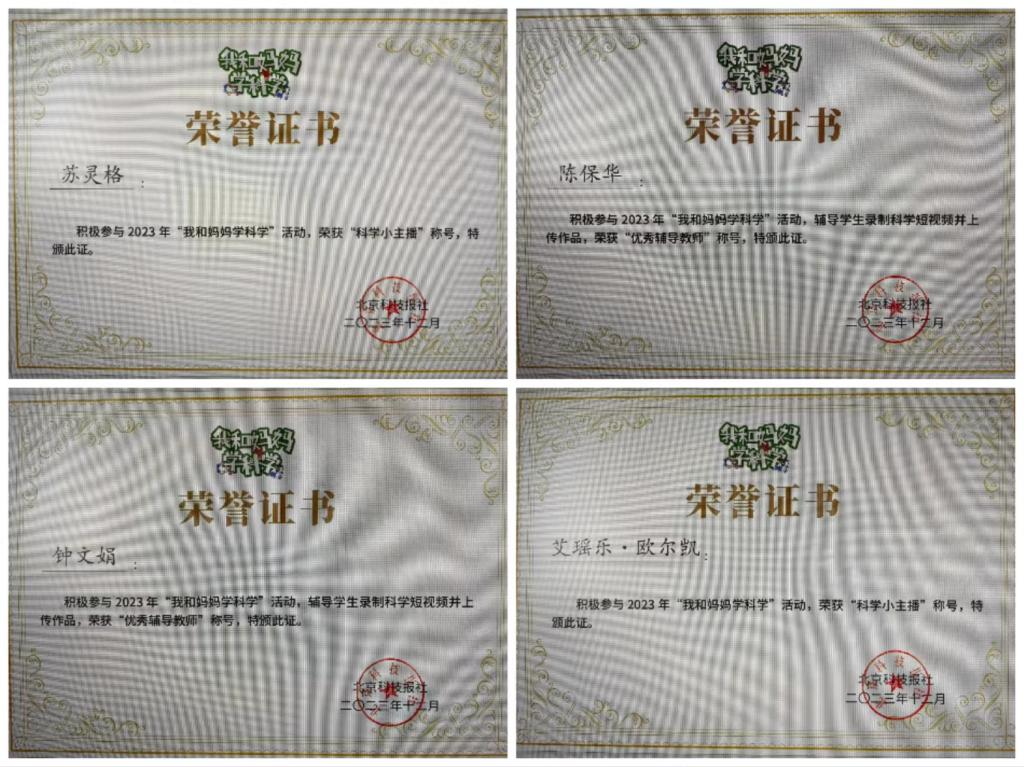近日,2023年“我和媽媽學科學”全國優秀科普短視頻及優秀組織單位名單公布。本次展評活動中,博樂市錦繡小學一分校、精河縣第二中學的2名學生及輔導老師分別榮獲“科學小主播”和“優秀輔導教師”稱號,博州科協、溫泉縣教育局、溫泉縣初級中學、精河縣第二小學、精河縣第二中學5家單位榮獲“優秀組織單位”。